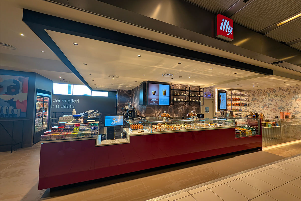 Il primo spazio è dedicato al caffè d'eccellenza, Illy Caffè, situato nell'area partenze dell'Aeroporto. Un progetto che unisce design moderno, funzionalità e la rinomata qualità del marchio Illy per offrire ai viaggiatori un'esperienza di pausa unica prima dell'imbarco.