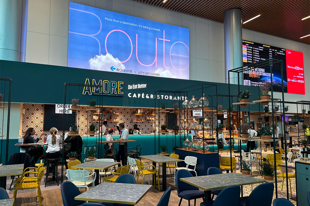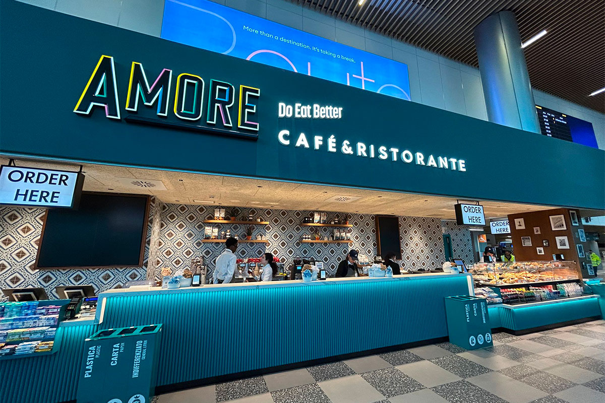 Infine è stato aperto il ristorante "Amore", il format di cucina fast casual all'italiana sviluppato dal Gruppo Autogrill. Situato nell'area check-in partenze, il nuovo locale "Amore, Do Eat Better" rappresenta un punto di riferimento per i viaggiatori in cerca di un'offerta ristorativa che coniughi la velocità del servizio aeroportuale con l'autenticità e il gusto della tradizione culinaria italiana.